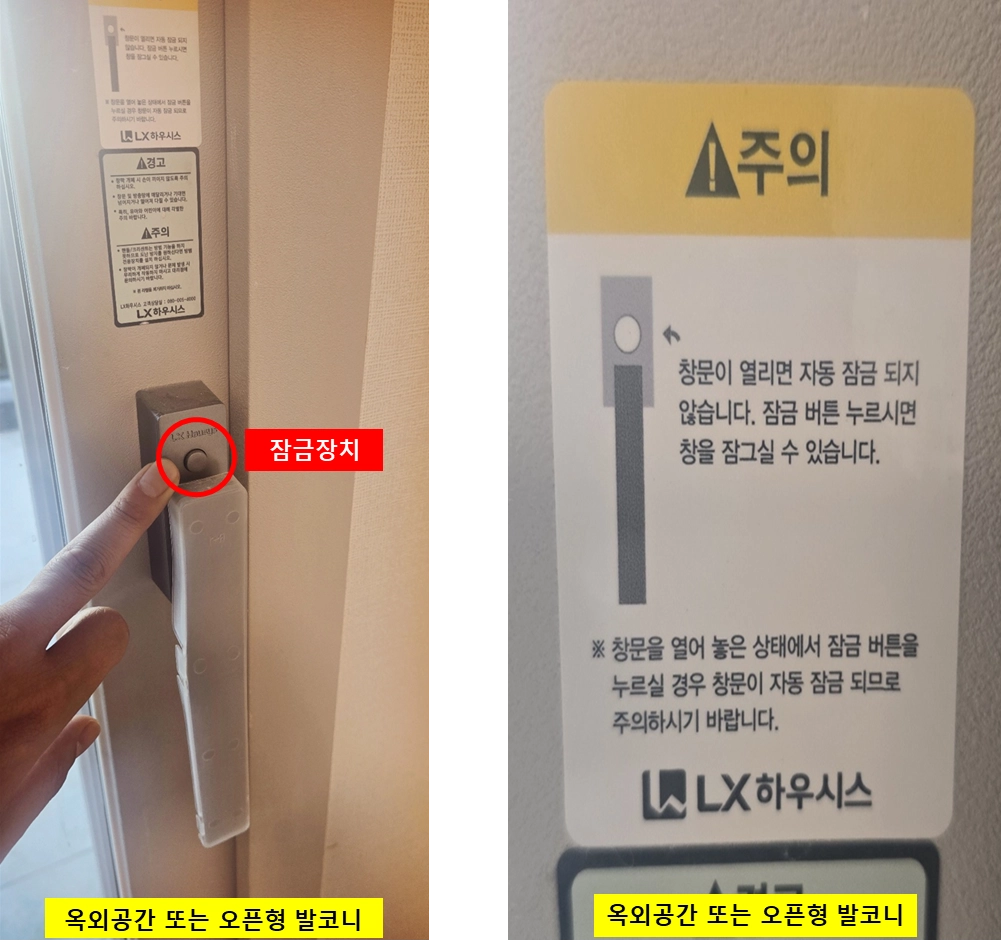 옥외공간 또는 발코니가 없는 부위의 PL창호 손잡이는 자동 잠김 기능이 있는 손잡이가 설치 되어 있습니 다. (단, 옥외공간 또는 오픈형 발코니가 있는 평형의 창호 손잡이는 갇힘 사고 예방을 위하여 수동잠김